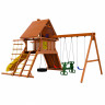 Игровая площадка изготовлена из клееного соснового бруса и массива сосны .Дерево обработано безопасной декоративно-защитной пропиткой. Технология значительно увеличивает срок службы конструкций, повышает прочность древесины, защищает её от гниения и грибков.